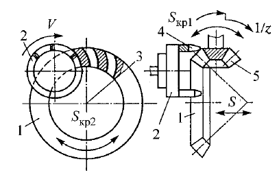 Рис. 10.63. Схема работы круговой резцовой головки: 1 – производящее колесо; 2 – резцовая головка; 3 – ось производящего колеса; 4 – резцы; 5 – нарезаемое колесо