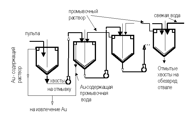 Периодическая декантация проводится в тех же аппаратах, в которых проводилось цианирование. С целью промывки вводят промывной раствор, перемешивают и вновь отстаивают. Число промывок зависит от объема промывных вод и заданной ЕAu – степени отмывки Au и CN- (см. практич. занятие). Этот метод применяется редко. Рисунок 21.