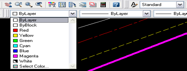 Цвет линий выбирается просто из списка (если не хватило, то Select Color…). Типы линий надо загружать Other>>Load. Толщина линий, даже увеличеннаяпо умолчанию не отображается, для проверки толщин линий на чертеже надовключать кнопку LWT на нижней панели программы.