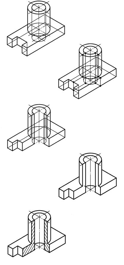 | 1. Анализ геометриче-ской формы детали, определение ее симмет-ричности. 2. Выбор места для вве-дения секущих плоско-стей. 3. Мысленное опреде-ление фигур сечения. 4. Построение фигур сечения. 5. снятие линий види-мого контура мысленно удаляемой части. 6. преобразование ли-ний невидимого контура в видимые (нижнее ос-нование отверстия), уда-ление остальных линий невидимого контура. 7. Штриховка фигур сечения, проверка, об-водка чертежа. |