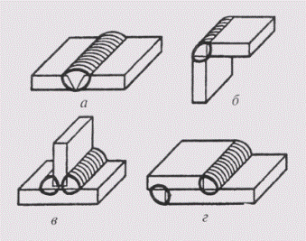 По способу взаимного расположения свариваемых деталей различают соединения стыковые (рис.3.1,а), угловые (рис.3.1,б), тавровые (рис.3.1,в) и внахлестку (рис.3.1,г). Вид соединения определяет вид сварного шва. Сварные швы подразделяются на: стыковые, угловые (для угловых, тавровых соединений и соединений внахлестку), точечные (для соединений внахлестку, сваркой точками).