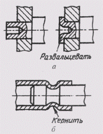 Вальцовкаи кернениеосуществляется деформацией соединяемых деталей (рис. 3.7 а, б). Сшивание нитками, металлическими скобками применяется для соединения бумажных листов, картона, различных тканей.
