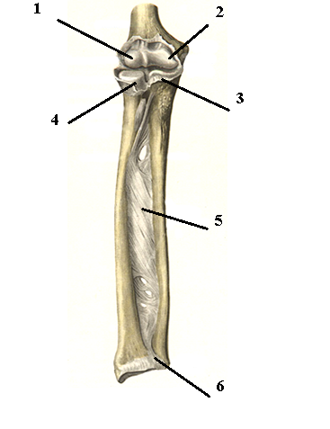 | 1 – головка мыщелка плечевой кости (capitulum humeri); 2 – блок плечевой кости (trochlea humeri); 3 – блоковидная вырезка лучевой гости (incisura treochlearis); 4 – головка лучевой кости (caput radii); 5 – межкостная перепонкаё предплечья (membrane interossea antebrachii); 6 – дистальный лучелоктевой сустав (articulatio radioulnaris distalis). |