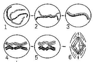 Рис. 2 Схема стадий профазы первого деления мейоза: 1 –лептонема, 2 – зигонема, 3 – пахинема, 4 – диплонема, 5-диакинез.