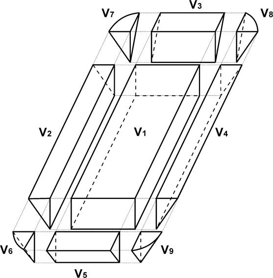 Об’єм кар’єру прямокутної форми за умовами задачі наближено можна розрахувати, як сукупність об’ємів простих геометричних фігур (див. схему):