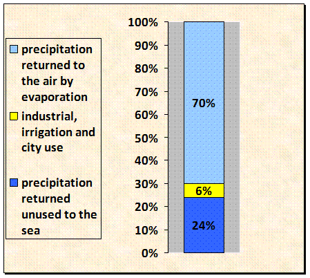 On the average, … gallons (… liters) of precipitation fall on the United States every day. About … per cent of this moisture returns directly to the air by evaporation, or is used by plants where it falls. People use about … per cent of the precipitation.