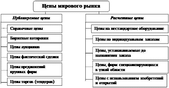 Мировые цены − это усредненные цены, по которым предлагаются к реализации различные товары на международном, внешнем рынке с учетом, прежде всего сбалансированного соотношения спроса и предложения на эти товары. Если на сырьевые товары, в том числе на энергоносители цены формируются сравнительно просто (можно достичь соглашения на рынке среди экспортеров однородной продукции), то определение внешнеторговых цен на машины и оборудование, запасные части и вспомогательные материалы достигается с большим трудом. Сотни и тысячи наименований похожих товаров, различающихся по качеству изготовления, модификации технических параметров, конкурентоспособности, способам доставки к потребителям, вызывают необходимость применения множественности цен.