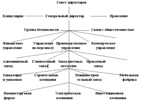 Виталий Зверев, генеральный директор металлургической компании, докладывал Совету директоров организационное построение компании. Схема спроектированной им организационной структуры изображена на рис. Один из членов Совета директоров высказал сомнение, целесообразно ли иметь руководителю организации такое большое количество подчиненных, на что Виталий ответил: "Я не верю в теорию, согласно которой руководители должны иметь ограниченное число подчиненных. Это разбазаривает ресурсы и создает бюрократию. Все мои подчиненные – хорошие люди и знают, что они должны делать. В любую минуту они могут обратиться ко мне за помощью в решении любых проблем. Кроме того, я предпочитаю знать из первых рук, как каждый из них работает, указать на ошибки и недостатки немедленно. Почему заведующий секцией в универсальном магазине может иметь в подчинении 25-30 человек, то и я справлюсь. Я полагаю, что вы поставили меня на эту должность для того, чтобы я работал на компанию весь рабочий день".