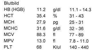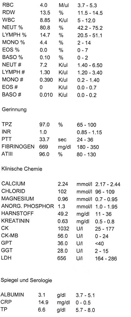 Легкое с умеренным потемнением вверху слева, в целом – прозрачное с обеих сторон с немного усиленным проступанием легочных сосудов. Тень сердца справа увеличена (CTR 0,57). Углубление свободное, без задержки кровотечений. Кости грудной клетки незаметны. 6 Церкляжная проволока на нужном месте. Высокое стояние диафрагмы слева.