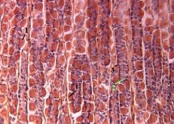 париетальные клетки (1) - крупные, оксифильные, расположены на периферии концевых отделов, продуцируют HCl;