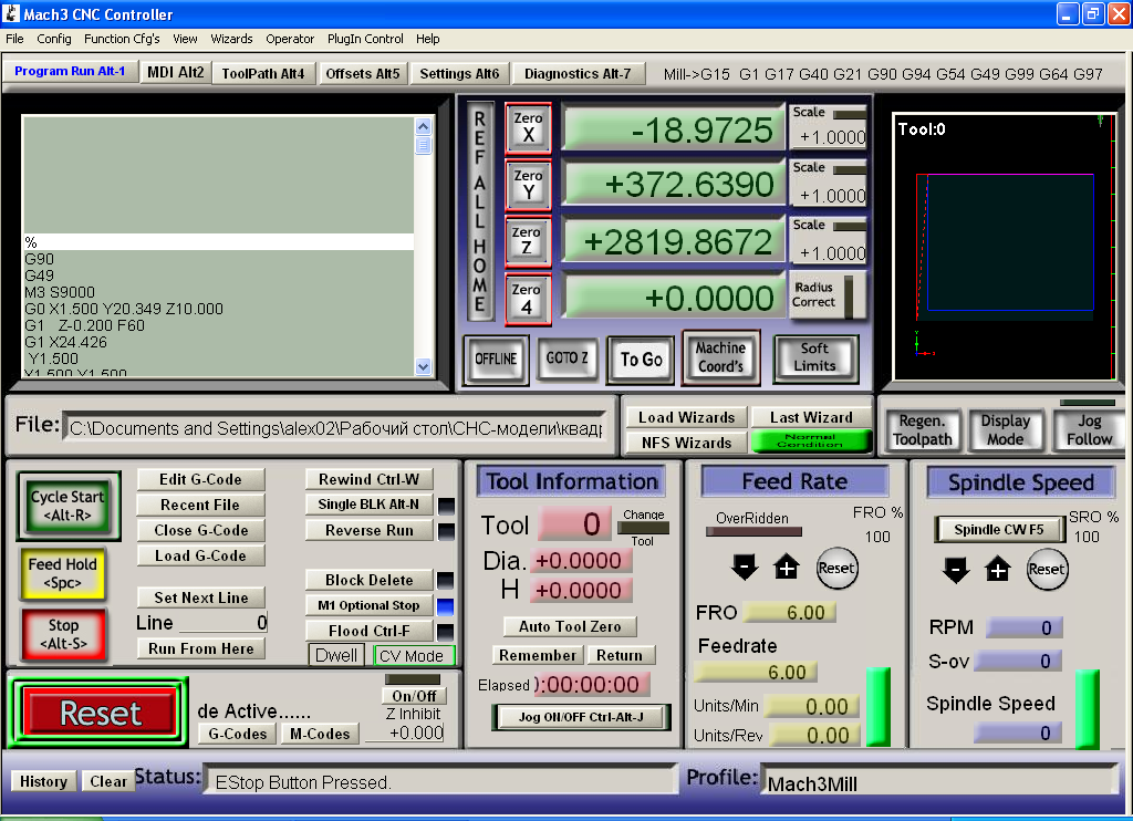 2. Загрузка программы с G-кодами и ее запуск/остановка.