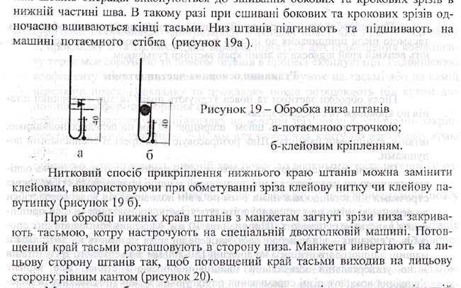 В моделях штанів з кишенями, розташованими в бічних швах чи на передніх половинках, бічні зрізи зшивають при обробці кишень. В моделях з прорізними кишенями бічні зрізи зшивають після обробки кишень на передніх та задніх половинках штанів. Ширина бічного шва 10 мм, зшивання виконують по передніх половинках. Шви розпрасовують на пресі (рисунок 169 б, в).