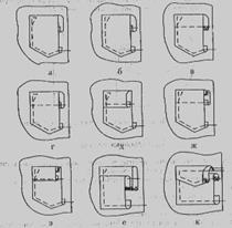 Верхній зріз накладної кишені з суцільнокроєною обшивкою запрасовують з закритим зрізом (рисунок а ), з застроченим зрізом обшивки – швом у підгин (рисунок б ), застрочують з обметаним зрізом обшивки (рисунок в ), настрочують швом у підгин на лицьовий бік (рисунок д ), з відрізною обшивкою настрочують швом у підгин із закритим зрізом на виворітний бік (рисунок ж ), на лицьовий бік ( рисунок з ), з пришивною листочкою (рисунок е).