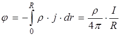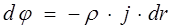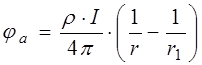 3. Потенціал поля струмового уніполя в однорідному середовищі ρ = const (мал. 5.14). Користуючись законом Ома в диференційній формі, oзначенням густини струму j = I/S, і тим, що у даному випадку S – площа поверхні сфери радіусом r (S = 4pr2), знайдемо: