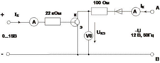 - Соберите цепь согласно схеме (рис. 4.2.2). В этой цепи в качестве источника синусоидального напряжения используется линейное напряжение трехфазного генератора, а диод включен для исключения обратного напряжения на транзисторе. Приборы А1 и V0 – входы коннектора, служащие для вывода тока IК и напряжения UKЭ на виртуальный осциллограф. Миллиамперметр А служит для измерения тока базы и может быть как мультиметром, так и виртуальным прибором.