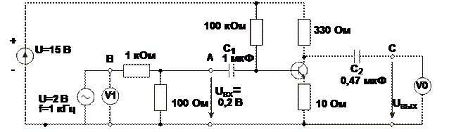 - Теперь определите выходное сопротивление RВЫХ. Для этого включите нагрузочный резистор RН = 1 кОм параллельно выходу усилителя (точки С -0). Это также вызовет снижение выходного напряжения усилителя от U1 до U2. Выходное сопротивление можно вычислить, используя соотношение: