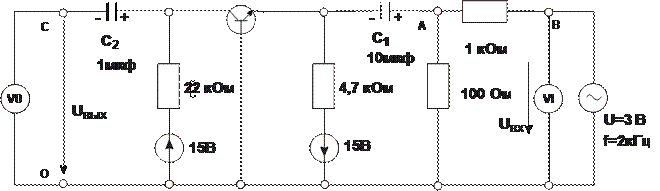 Примечание: К выходу источника переменного тока подключен делитель напряжения (1 кОм/100 Ом), чтобы обеспечить более точную регулировку и измерение входного напряжения. Это означает, что при напряжении источника U= 2 В на входе усилителя будет напряжение UВЫХ = 0,2 В.