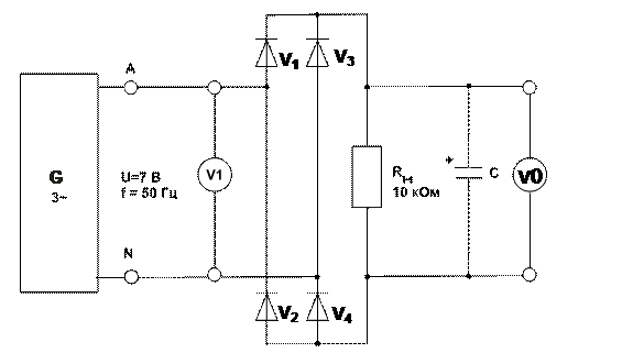 • Соберите цепь согласно схеме (рис. 1.3.2) без сглаживающего фильтра. На схеме V0 и V1 - входы коннектора. При сборке схемы обратите внимание на полярность электролитического конденсатора.