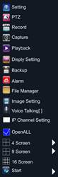 The menu consists of display setting, PTZ, setting, playback, record, alarm, capture and file manager etc.