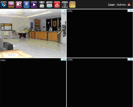 The device enters the real-time monitoring screen after normal booting. There are superposed date, time, and channel name of every channel. Icons of record, 3D positioning and alarm status will appear in the right upper corner.