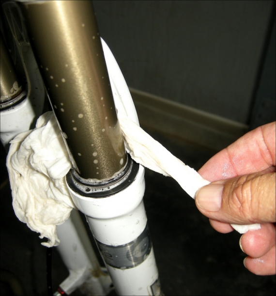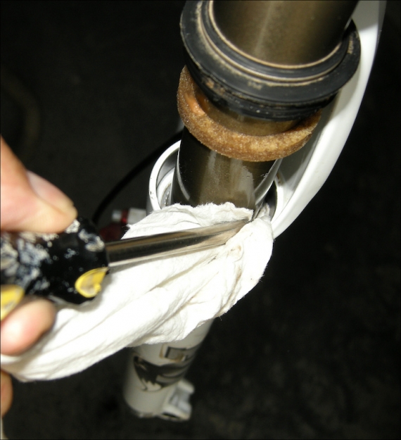 Шаг 8: Произведите визуальный осмотр, чтобы убедиться, что пыльники установлены на подвижных частях ровно, а затем подвигайте вилку примерно десять раз, чтобы добиться плавного хода. Вытрите с вилки излишки масла и можно ехать.