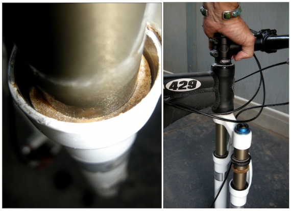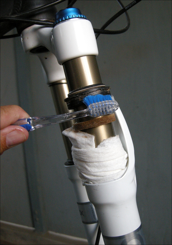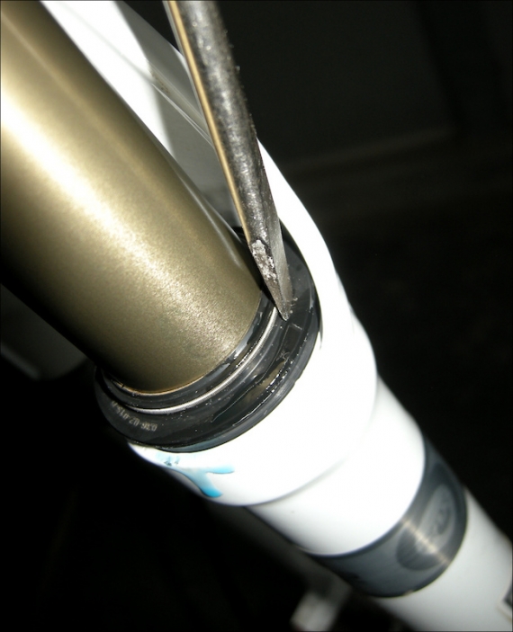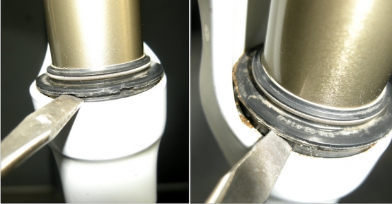 Шаг 3: Загляните внутрь подвижной части и вы увидите поролоновое смазочное кольцо скольжения – в большинстве вилок оно используется в качестве резервуара для смазочного масла, для постоянного нанесения на стойку свежей смазки. Если вам повезет, вы сможете подцепить их отверткой, но намного проще поставить велосипед на землю и сжать вилку, чтобы они поднялись. Поднимите поролоновые кольца вверх к уплотнениям.