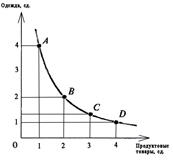Для того, чтобы увеличить количество потребления продуктовых товаров с одной до двух единиц, необходимо пожертвовать двумя единицами одежды (отрезок АВ на кривой), с двух единиц до трех - 0,7 единицы одежды (отрезок ВС) и 0,3 - с трех до четырех (отрезок CD). Предельный коэффициент замещения составил 2; 0,7; 0,3, т.е. стал меньше. Отсюда следует, что по мере того, как продуктовых товаров становится больше, мы платим за них все меньшим количеством одежды.