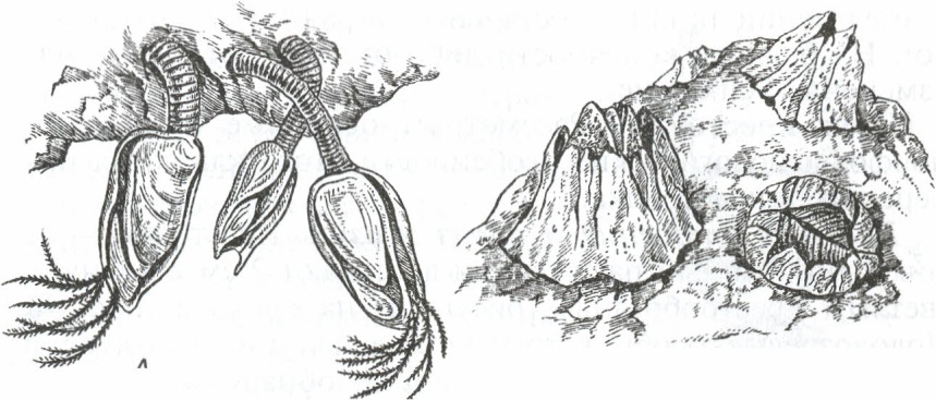 | Рис. 45. Усоногие раки: А - морские уточки; Б - морские желуди |