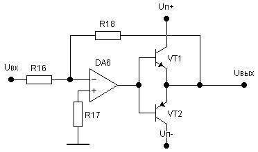 Для этого можно применить, например, мощные выходные каскады. Для низкочастотных входных сигналов можно использовать двухтактные эмиттерные повторители в режиме В (см. рис.1). При положительных входных сигналах транзистор VT1работает как эмиттерный повторитель, а транзистор VT2 заперт. При отрицательных входных напряжениях – наоборот. Таким образом транзисторы работают попеременно, каждый в течении одного полутериода входного напряжения. При Uвх=0 оба транзистора заперты; следовательно, схема имеет малый ток покоя. Ток, потребляемый как от положительного, так и от отрицательного источника напряжения равен току в нагрузке. Поэтому схема обладает существенно более высоким коэффициентом полезного действия по сравнению с обычным эмиттерным повторителем. Еще одно различие состоит в том, что выходное напряжение при любой нагрузке может достигать ±U, поскольку транзисторы не ограничивают выходной ток. Таким образом, в схеме не требуется согласования нагрузки, и максимальная мощность на выходе определяется лишь предельным током и максимальной мощностью рассеивания используемых транзисторов.