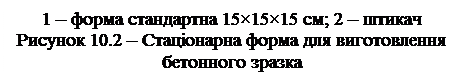 Після досягнення заданої рухомості бетонної суміші, її знов перемішують та використовують для виготовлення бетонних зразків-кубів. Для цього бетонну суміш умощують у попередньо зважену металеву форму розміром 15×15×15 см та ущільнюють відповідно до вимог для виготовлення бетонних зразків за ГОСТ 10180-90. Виготовляють серію зразків – 3 шт., припускається також виготовлення серії з 2-х зразків (рис. 10.2).