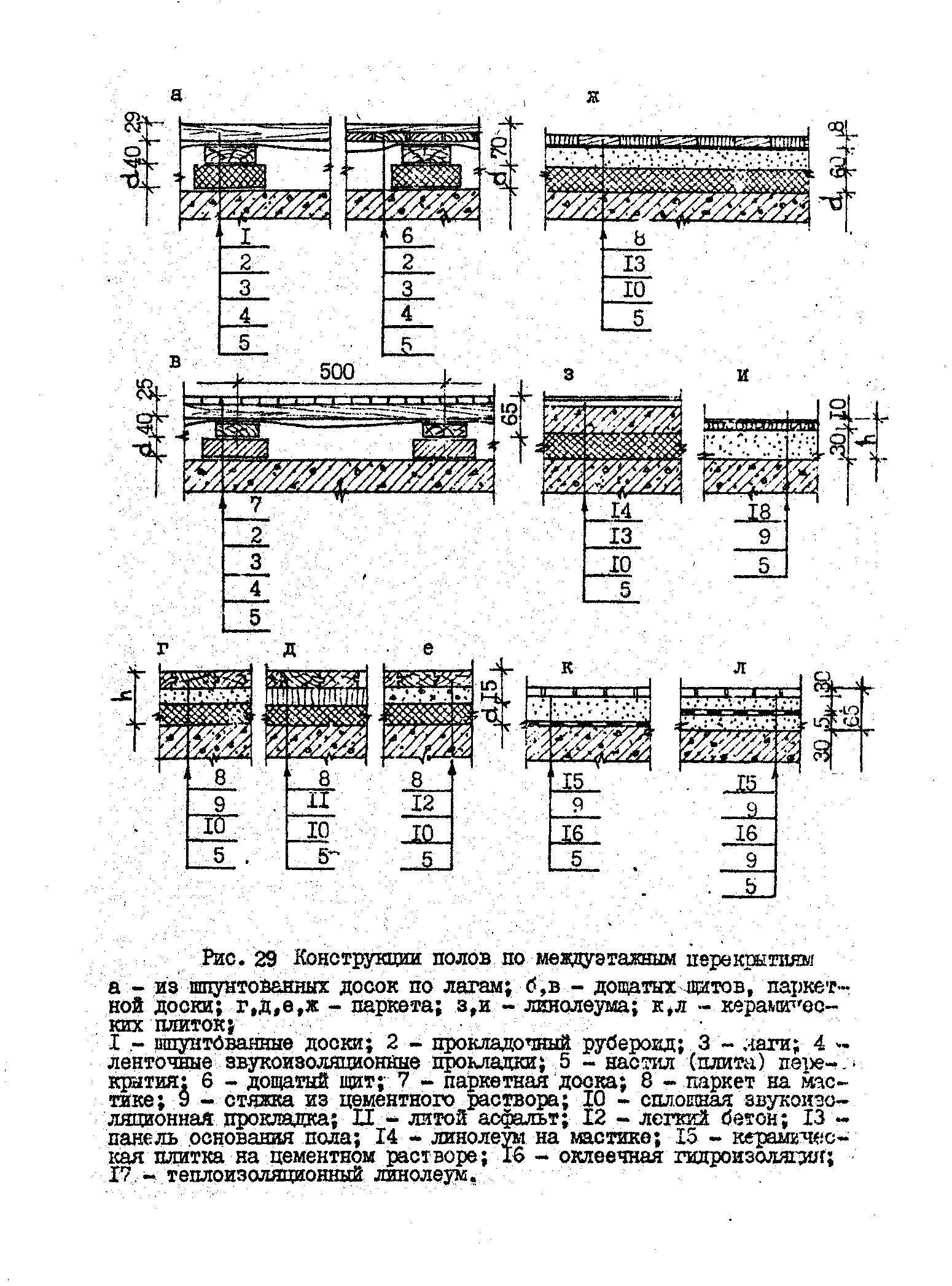В акустически однородных перекрытиях основанием пола является поверхность несущих элементов перекрытия (настилов, панелей) или цементно-песчаная стяжка. Покрытием пола в этих перекрытиях служит теплозвукоизоляционный линолеум или другой звукоизоляционный материал (рис,29, и).
