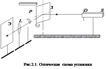 Оптическая схема установки представлена на рис.2.1. На оптической скамье с помощью специальных держателей устанавливаются осветительный узел S и черное зеркало З . Осветительный узел состоит из лампы, конденсорной линзы для получения пучка параллельных лучей и сменной диафрагмы D , ограничивающей световой поток. Черное зеркало отражает световой пучок, падающий под некоторым углом. Угол падения света на зеркало можно менять, поворачивая плоскость зеркала. На пути отраженных лучей устанавливается поляроид Р , который можно поворачивать вокруг оси падающего светового пучка. Собирающая линза L фокусирует изображение источника на экране Э .