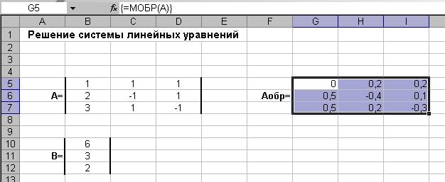 Теперь определяем обратную матрицу. С этой целью выделяем диапазон G5:I7, после чего в строку формул вводим формулу =МОБР(А) (рис.4).