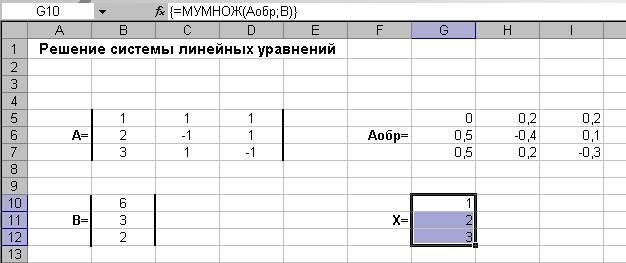 В результате проделанных вычислений получаем вектор Х, элементы которого записаны в ячейки диапазона G10:G12 и определяют последовательно значения: X1 (ячейка G10), X2 (ячейка G11), X3 (ячейка G12).