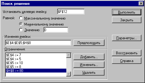 В окне Установить целевую ячейку укажите ячейку F12, содержащую модель.