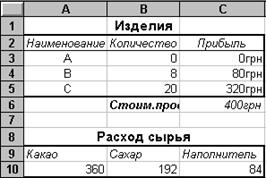 Предположим, что мы решили производить несколько видов конфет. Назовем их условно "A", "B" и "C". Известно, что реализация 10-и килограмм конфет "А" дает прибыль 9 грн., "В" - 10 грн. и "С" - 16 грн.