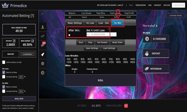 Во вкладке On Win: 1) Если ставим галочку в строке After Win и вписываем сумму сатош в строке Bet X Until Loss - будет означать что после выпадения плюсовой комбинации, наша начальная ставка изменится на то количество сатош что впишем, и будет играть дальше этой ставкой. (В нашем случае мы ничего здесь не пишем) После того как вы задали любые ваши параметры ОБЯЗАТЕЛЬНО жмем кнопку SET PARAMS