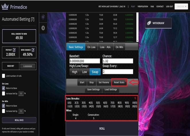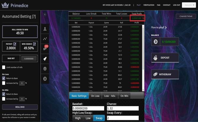 Видим в процессе игры ставка автоматически переставляется выше-ниже 2) в нашем случае после каждых 2 ставок 3) Здесь можем задать High - игра всегда выше, Low - игра всегда ниже, Swap - ставим число после какой ставки будет чередование выше-ниже