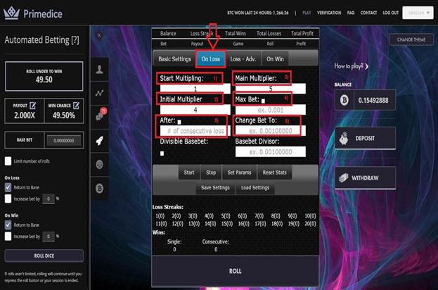 Открываем вкладку On loss: 1) в строке Start Multipling вписываем число, которое означает? после какого минуса у нас будет умножение нашей ставки (в нашем случае умножение будет после первого минуса) 2) В этой строке (Initial Multiplier) указываем число ВО СКОЛЬКО РАЗ умножится наша ставка (в нашем случае это 4 - 4*200=800 сатош, будет ставка после первого минуса 3) В строке Main Multiplier вписываем число ВО СКОЛЬКО РАЗ умножится наша вторая ставка, если тоже будет минус - в нашем случае 800*5=4000 сатош будет ставка после второго минуса 4) В этой строке (Max Bet) можем вписать сумму в сатошах, какую можем максимально позволить себе потерять - в нашем случае мы ничего туда не пишем 5) В строке After, если ставим галочку и если вписываем число 4,5,6 или дальше - будет означать после какого минуса подряд мы можем изменить нашу ставку на другую 6) Change bet to - в этой строке мы указываем на какую ставку мы меняем (в нашем случае мы ничего здесь не указываем) После того как вы задали любые ваши параметры ОБЯЗАТЕЛЬНО жмем кнопку SET PARAMS