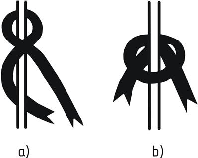 Исторически различают скандинавские и испанские одинарные узлы. Испанские узлы иногда называют арабскими. Одинарные скандинавские узлы дают более плотный ворс. Ими легко выполнить тонкую линию узора, если другой ворс вяжут двойными или полуторными узлами. Техника исполнения скандинавского узла показана на рис. 63.