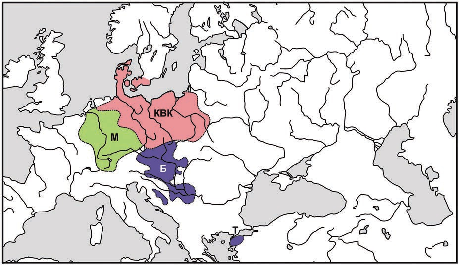 Рис. 106. Провідні культури Європи V-IV тис. р. до н. є.: КВК – культура воронковидних кубків, М – міхельсбергзька культура, Б – культура Баден, Т – Троя [145].