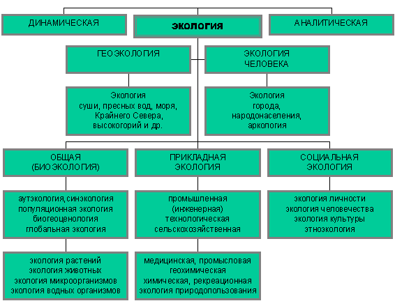 Выделяют крупные подразделения: общая экология (биоэкология – биологическая дисциплина, исследующая закономерности жизни экосистем, популяций и отдельных организмов), геоэкология, прикладная экология, экология человека и социальная. Классификация био-экологии по уровням биотических систем представлена аутэкологией (особей и организмов), синэкологией (экология сообществ), популяционной экологией и пр. В последние годы в связи с возникшими глобальными экологическими проблемами особую актуальность приобретает прикладная экология с различными направлениями. Поэтому экология создает фундамент для решения проблем в области рационального природопользования и охраны окружающей среды, что необходимо для ; создания благоприятных условий существования человеческой цивилизации. Американский эколог Ю. Одум (1986) писал: “Когда “наука о доме” (экология) и наука «о ведении домашнего хозяйства» (экономика) сольются, и когда предмет этики расширит свои границы, и включит в себя наряду с ценностями, произведенными человеком, ценности, создаваемые окружающей средой, тогда мы на самом деле сможем стать оптимистами насчет будущего человечества»