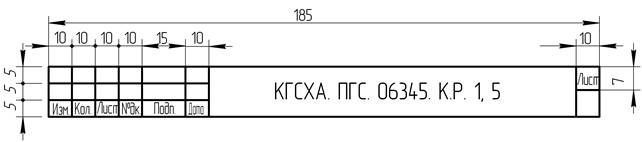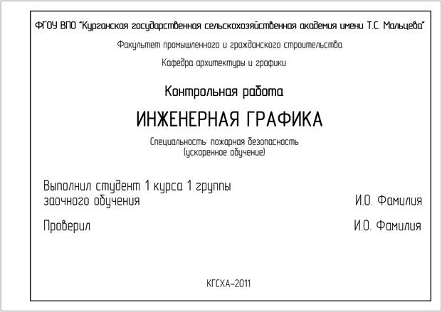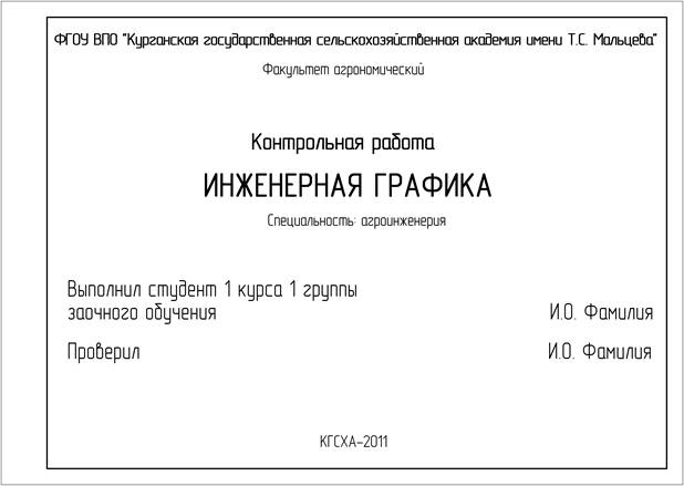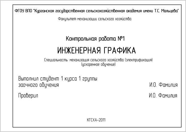 Запись в основной надписи «КГСХА. ПГС. 06345. КР. 1,5» означает: КГСХА – Курганская государственная сельскохозяйственная академия, ПГС – факультет промышленного и гражданского строительства, 06345 – номер зачетной книжки студента, КР. 1,5 – контрольная работа №1, вариант 5. Студенты других факультетов вместо «ПГС» пишут соответствующую аббревиатуру.