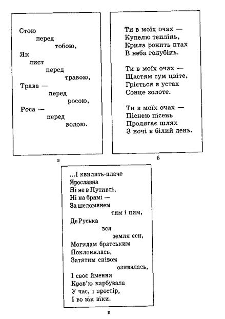 Рис. 31. Варіанти побудови вільного вірша: а - ступенева, б — прапорцева, в — змішана