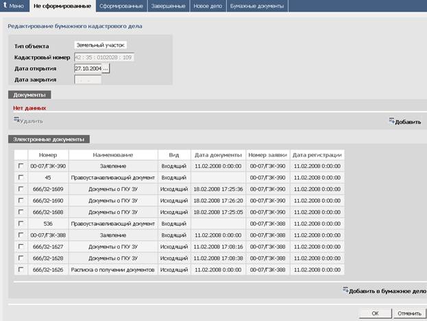 Формирование/редактирование дела подразумевает возможности добавления/удаление документов в дело, редактирование информации по документу.