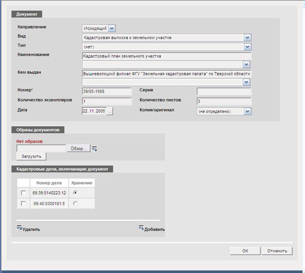 Существует возможность добавить в список номера кадастровых дел, к которым документ относится, и указать в каком деле хранится документ фактически: