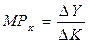 Аналогично, MPK (marginal product of capital) – предельный продукт капитала – дополнительный продукт, полученный в результате дополнительных вложений капитала K при неизменной величине труда: