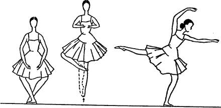 В старших классах — прыжок более высокий и мощный, причем нога вынимается на 90° в позы attitude, arabesque, ecartee вперед и назад и т. д. Совершенствуя sissonne ouverte, можно его делать, отлетая в сторону, причем, если вы прыгаете вперед, поза будет назад — attitude или arabesque, при прыжке назад — поднятая нога примет позу вперед; для позы ecartee — отлетать в сторону и т. д., сообразуясь с направлением требуемой позы (рис. 67).