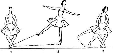 V позиция, правая нога впереди, demi-plie, прыжок не вертикально вверх, а с отлетом в сторону, вся фигура отлетает налево, и правая нога открывается на II позицию.
