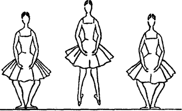 2. В момент прыжка следует держать ноги напряженно вытянутыми в колене, подъеме и пальцах, если прыжок делается двумя ногами. Если же он делается на одну ногу, другая принимает требуемое позой положение, причем надо строго соблюдать выворотность верхней части ноги и стройность спины, т. е. не выпячивать ягодиц.